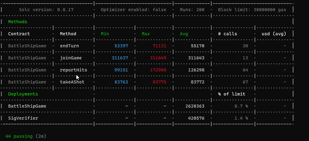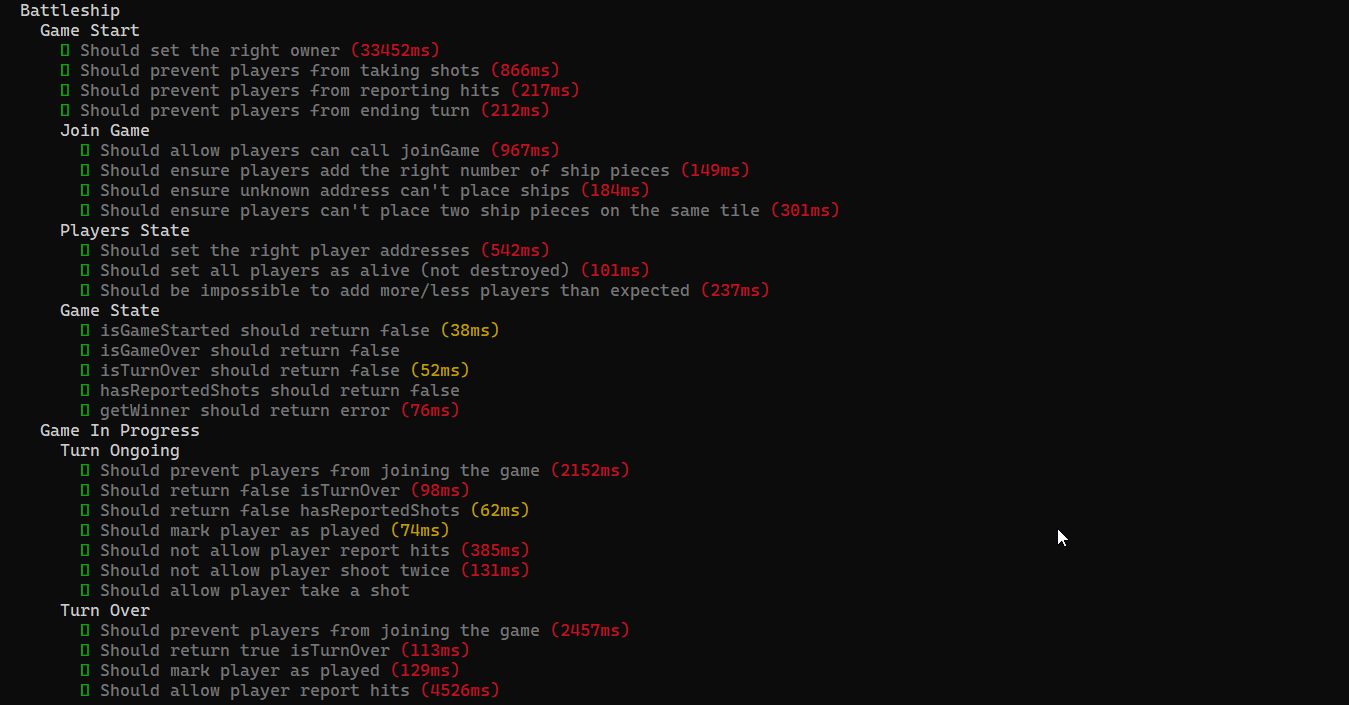 • playerHasReportedHits — a mapping of each player’s address to a boolean indicating whether that player has reported all the hits from their opponent’s shots during the current turn.