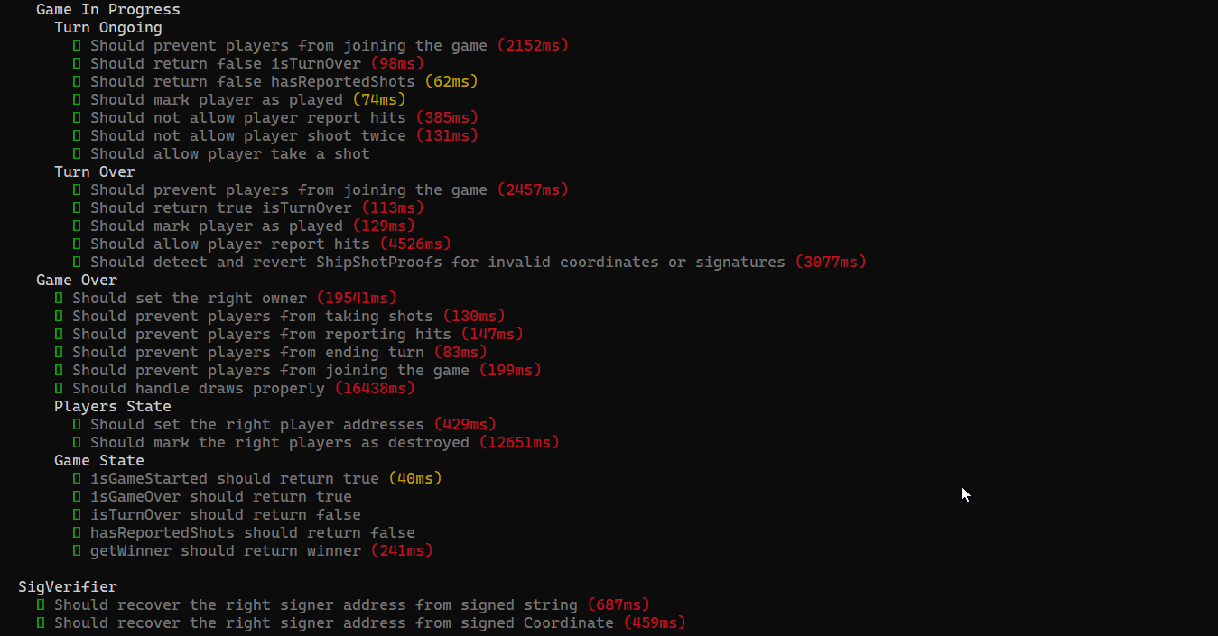 • generateShipShotProof(player: Signer, allPlayers: Array<string>, battleshipGame: any) quickly generates a list of proofs for each reported shot coordinate.